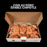 filet de porc, poitrine de poulet, bacon (porc), huile végétal, cassonade, sirop d'éralble, sauce worcestershire (vinaigre, sucres (,mélasse verte, glucose, sucre), eau, sel, caramel, épices, anchois (poisson), arôme naturel (soya), exrait de tamarin, silicone de diméthyle), chipotle (purée de légumes (poivron rouge rôti, oignon, eau, carottes, céleri, ail, acide citrique, sel), sucre (maltodextrine de mais, sucre), huile végétale, chipotle en poudre, piment jalapenos, vinaigre, sel, arôme naturel), sel, oignon déshydraté, amidon de mais modifié, shortening d'huile de palme, vinaigre, extrait de levure, huile de canola, épices, arôme de fumée de bois de pommier (moutarde), fumée liquide