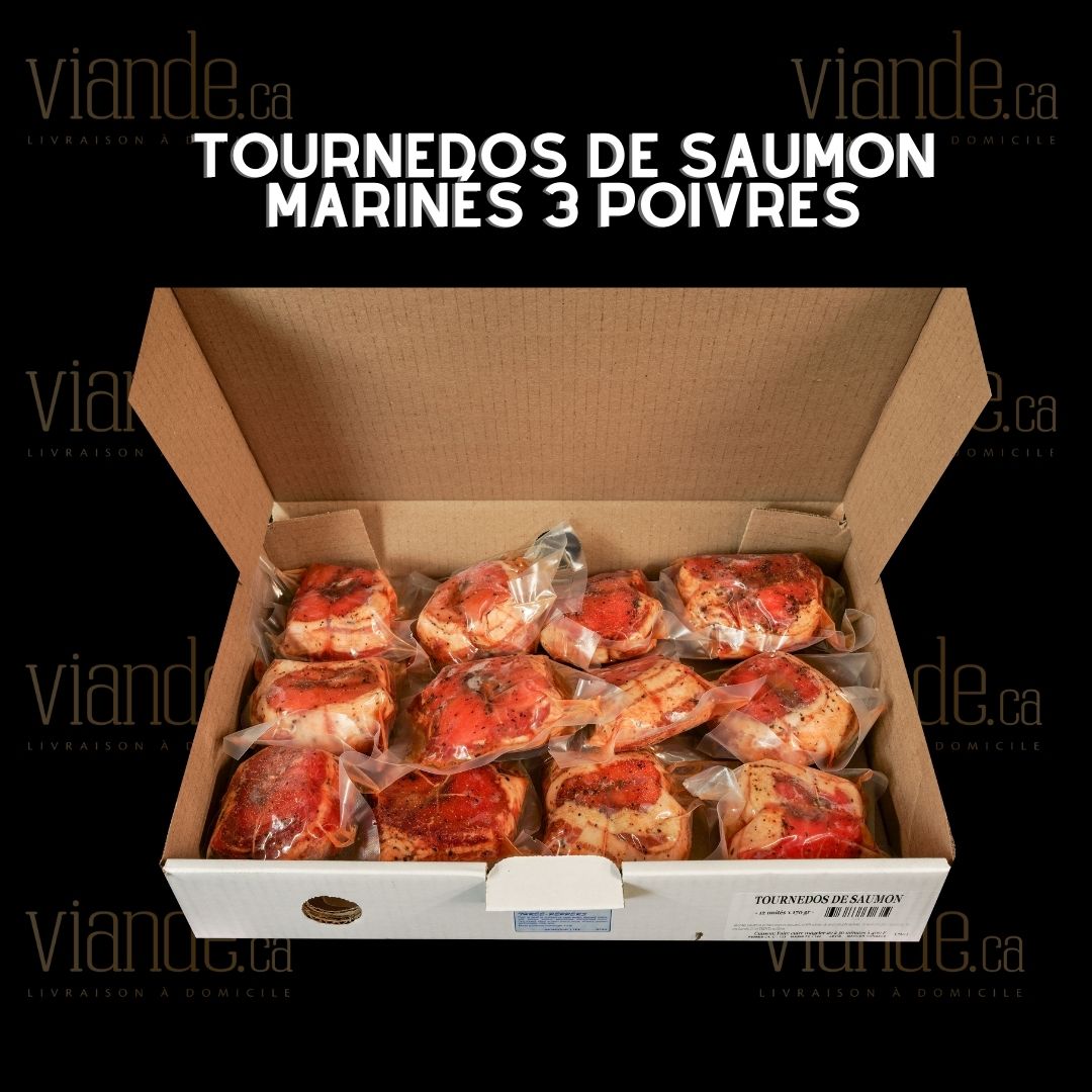 Tournedos de saumon marinés trois poivres vendus en boîte de 12 unités de 170 g.