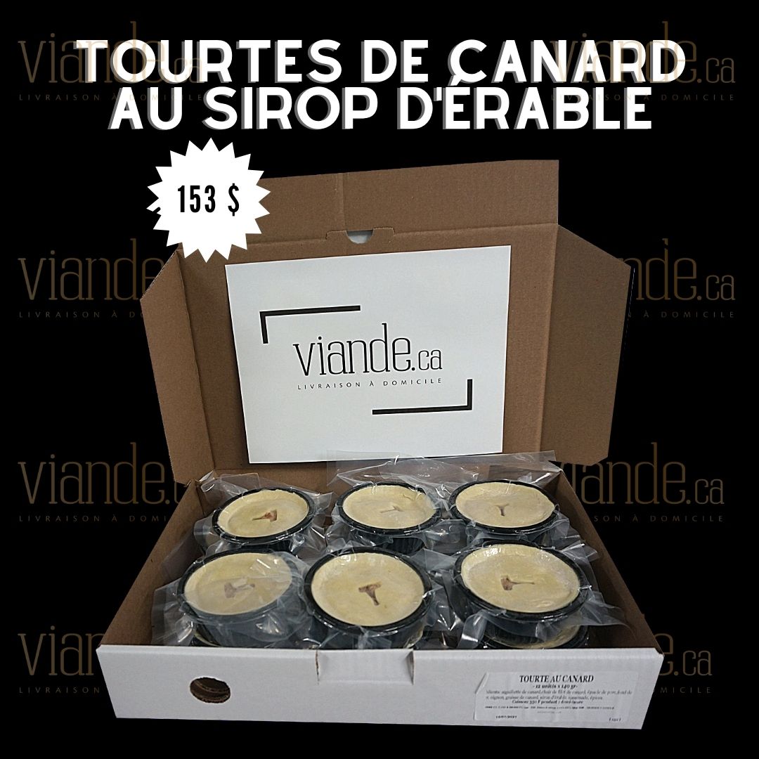 Tourtes de canard confites au sirop d'érable vendu en boite de 12 unités de 130g.
