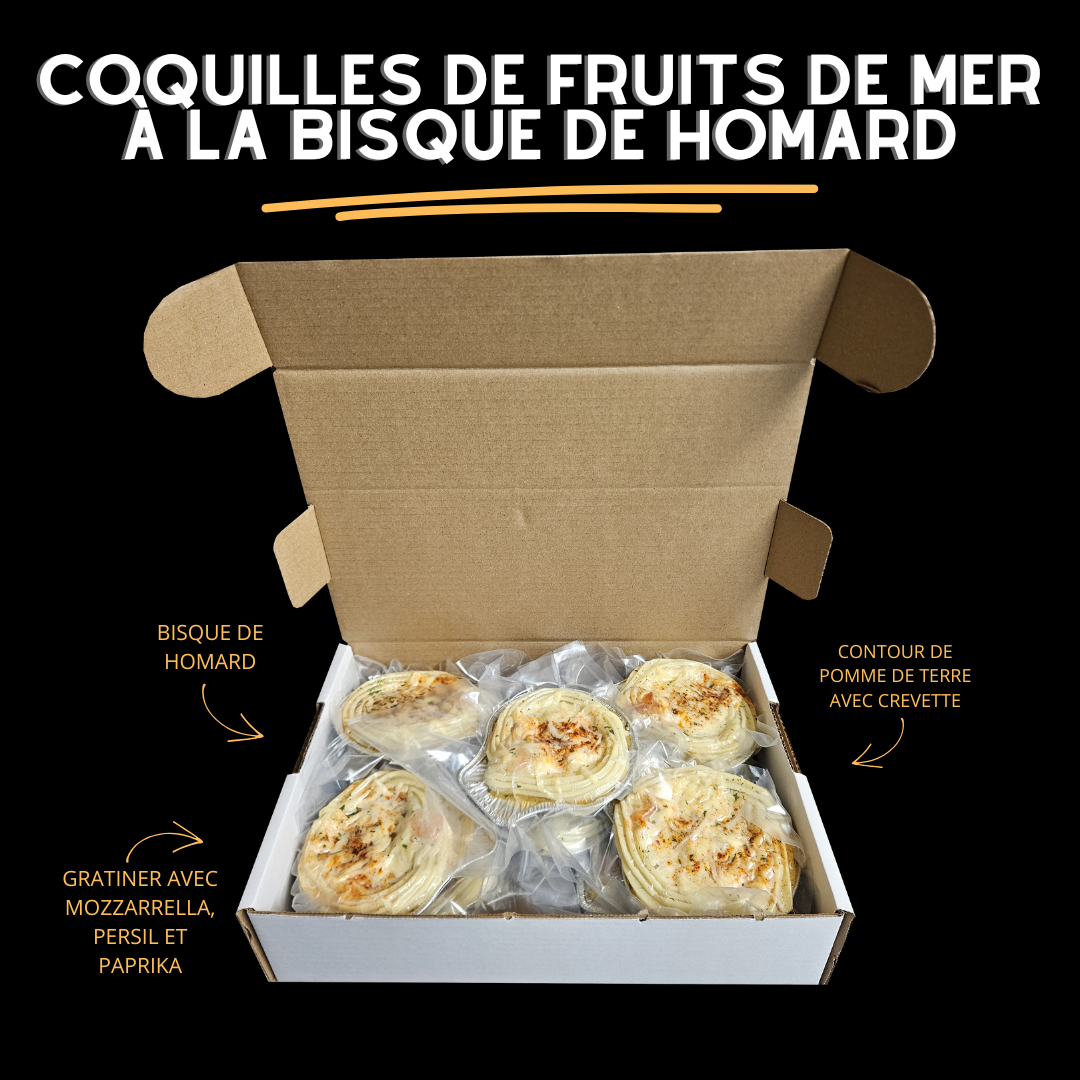 crevette, pétoncle, oignon, celeri, lait, farine de riz, sel, poivre, base de poulet (sucre (solides de glucose), amidon de mais, sel, gras de poulet déshydraté, oignon en poudre, protéine hydrolysée de mais, extrait de leverue, acide citrique, arôme naturel, bouillon de poulet, épices, extraits d'épices), vin blanc, persil, paprika, huile de canola, pate de tomate, chair de homard cuite (homard, sel), eau, extrait de levure, huile de mais, substance laitière, pâte de tomates, flocons de pommes de terre (pomme de terre, mono et diglycérides), poudre d'oignon, poudre d'ail, inosate asodique, guanylate disodique, paprika, épices, herbes