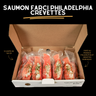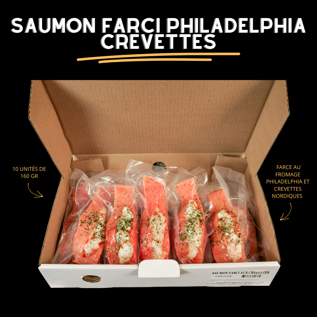Saumon farci au fromage Philadelphia et crevettes nordiques vendu en boite de 10 unités de 160 gr.