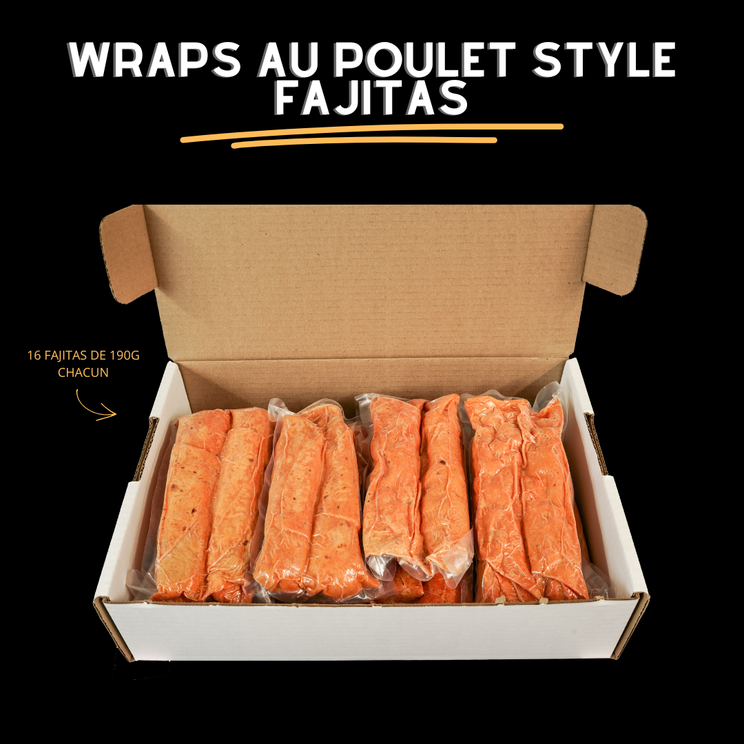Fajitas au poulet vendus en boite de 16 unités de 190g.