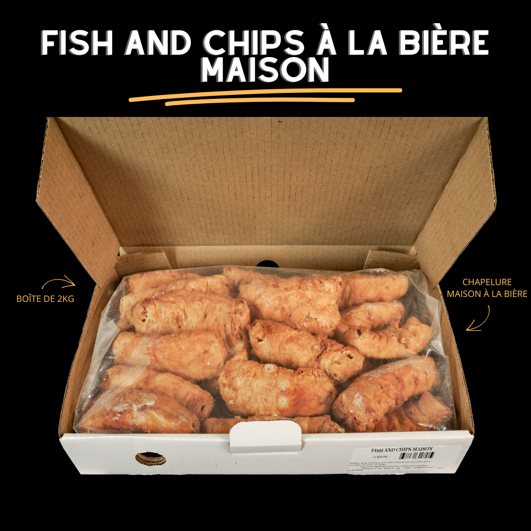 Fish and chips à la bière maison vendus en boîte de 2kg