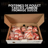 poulet, jambon (porc, eau, sel, sucres (extraits secs de glucose), phosphate de sodium, substance aromatisante, produit protéique de soya, érythorbate de sodium, nitrite de sodium, fumée, enveloppé de collagène), fromage suisse (lait pasteurisé, substances laitières modifiées, culture bactérienne, sel, chlorure de calcium, enzyme microbien), bacon (porc, eau, sel, erythorbate de sodium, phosphate de sodium, épices, nitrite de sodium, fumée)