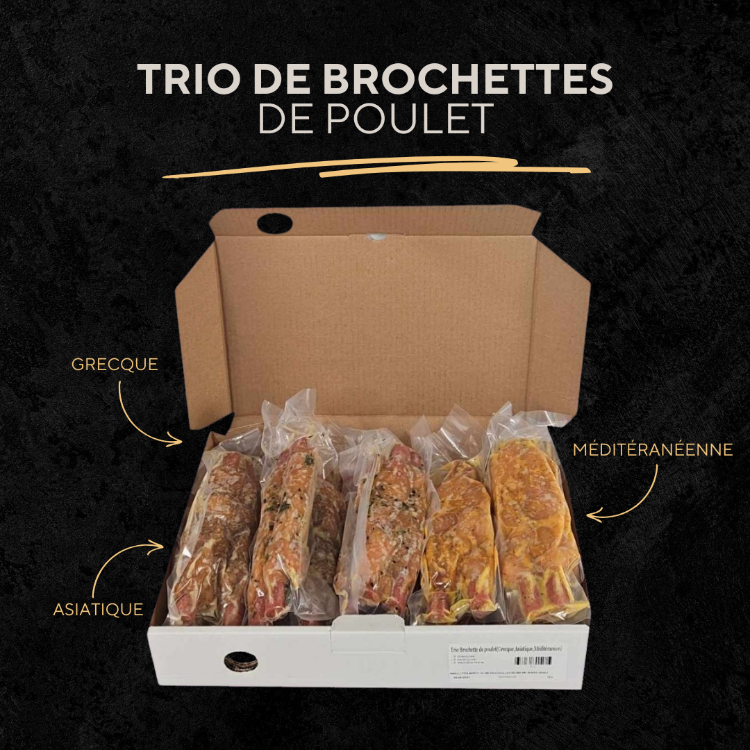 Trio de brochettes de poulet (grecque, asiatique, méditerranéenne)